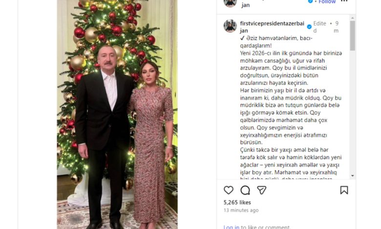 Azərbaycanın Birinci vitse-prezidenti Mehriban Əliyeva sosial media hesabında 2026-cı ilin ilk günü ilə bağlı paylaşım edib.