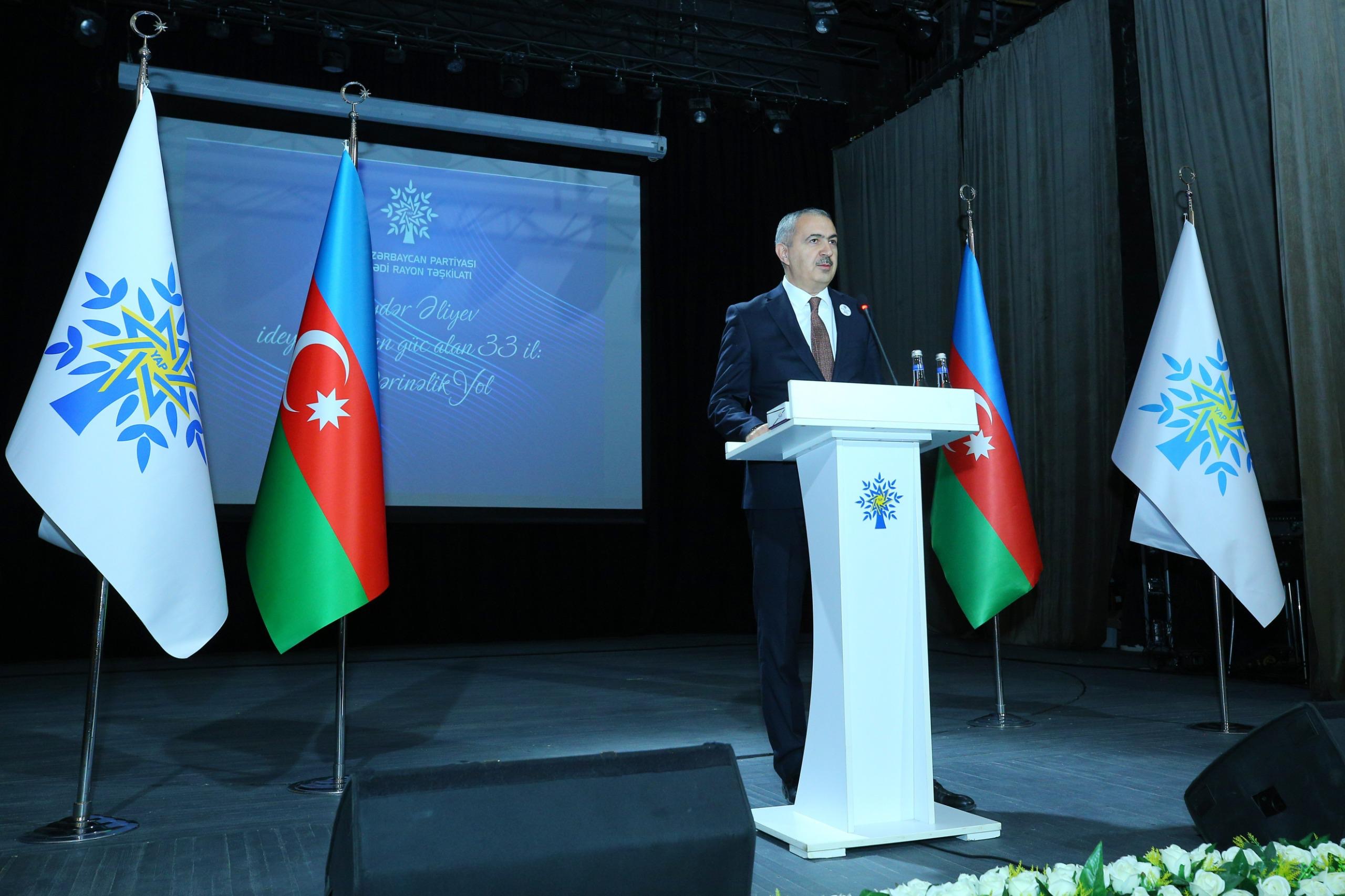 Yeni Azərbaycan Partiyasının Mərkəzi Aparatının şöbə müdirinin müavini Rafael Gülməmmədov çıxışında Yeni Azərbaycan Partiyasının təsis olunmasından, həmçinin ümummilli lider Heydər Əliyevin iştirakı ilə Naxçıvanda keçirilən Yeni Azərbaycan Partiyasının ilk iclaslarında bəhs edib. O, ümummilli lider Heydər Əliyevin siyasi strategiyası və cənab prezident İlham Əliyevin uzaqgörən siyasəti nəticəsində bu gün ölkəmizin çoxsaylı uğurlar qazanmasında Yeni Azərbaycan Partiyasının da əvəzsiz rolu olduğunu söyləyib. Bu gün ölkəmizin dünyada söz sahibi bir ölkə olduğunu, bütün sahələr üzrə dinamik və məqsədyönlü uğurlara imza atdığını qeyd edərək bütün bunları iqtidar-xalq birliyinin, həmrəyliyinin məntiqi nəticəsi adlandırıb.